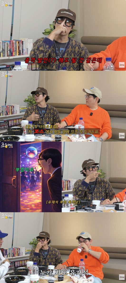 과거 일화를 언급하던 하하는 “솔직히 여기서 충격 발언 해도 될 것 같은데”라며, “저 보스(압구정 나이트클럽)에서 형들 옆에 앉은 적이 있었다. 룸이 2층이었는데, ‘부킹이요’ 하는데 유재석이다. 그걸 내가 본 적이 있다. 확실하다”라고 폭로했다. 지석진은 “그랬을 거다. 걔 또 눈에 띄는 얼굴이잖아”라며 인정해 웃음을 줬다. /seon@osen.co.kr