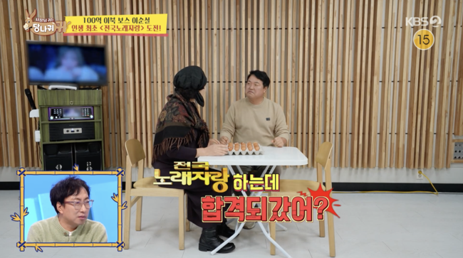 15일 오후 방송된 KBS 2TV ‘사장님 귀는 당나귀 귀’에서는 소문난 음치 이순실이 현숙의 도움을 받아 ‘전국노래자랑’에 도전하는 모습이 전파를 탔다.
