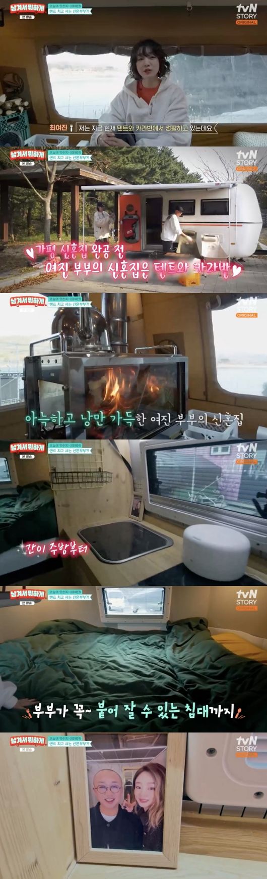이규한의 초대를 받은 최여진은 근황을 전하며 “텐트와 카라반에서 생활하고 있다. 가평에 신혼집을 차리고 있다. 공사가 지연돼서 공교롭게도 여기서 생활하고 있다"라고 설명했다.