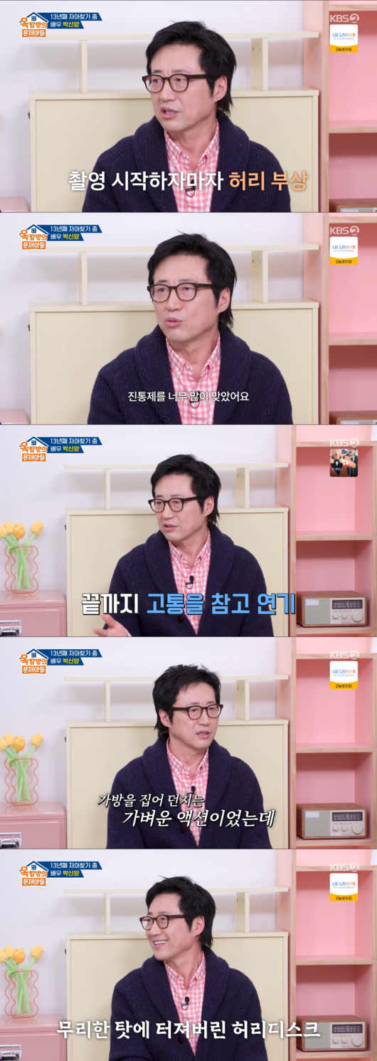 프랑스 파리 현지에서 디스크가 파열되는 절망적인 상황이었지만, 박신양은 촬영 스케줄을 위해 이를 악물고 버티며 한국으로 돌아왔다. 특히 그는 “비행을 할 때도 앉지 못하고 서 있었다”고 밝혀 당시 상태가 얼마나 심각했는지를 짐작게 했다.