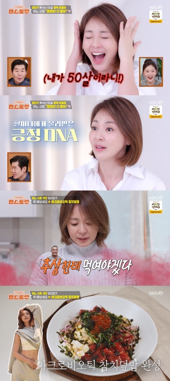 올해 50세라고 밝힌 야노 시호는 "아직 갱년기 없다"라며 운동과 함께 많이 자고, 많이 먹는 것이 건강 비결이라고 고백했다. 더불어 야노 시호는 "할머니가 올해 100살이다"라며 할머니부터 이어진 긍정 DNA를 전했다.