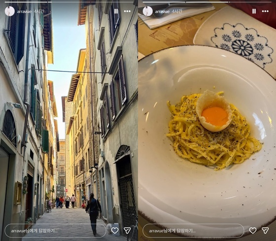 공개된 사진은 '피렌체 두오모'라고 불리는 이탈리아 토스카나주 피렌체에 위치한 산타 마리아 델 피오레 대성당을 찍은 것이다. 또 다른 사진에는 햇살이 내리쬐고 있는 피렌체의 거리와 파스타 등이 담겨있다. 신혼여행을 즐기고 있는 모습이 훈훈함을 준다.