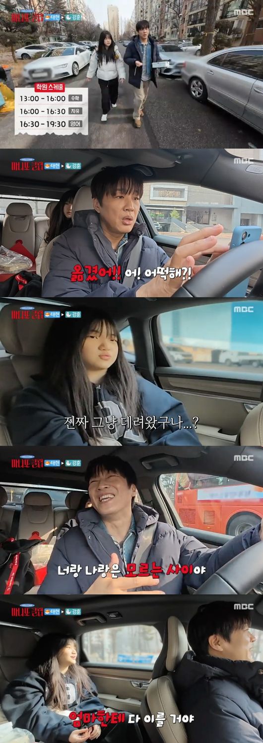 그럼에도 태은은 "실패해도 내 탓은 아니야"라며 차태현의 미션 성공을 걱정했다. 그러나 차태현은 "만약 걸렸다? 그러면 너랑 나랑은 모르는 사이다. 그러면 어디든 바로 가라. 버스를 타든 뭘 타든. 내가 거기로 데리러 가겠다"라고 무작정 딸과의 임시절연을 선언했다. 이에 태은은 "엄마한테 다 이를 거다. 자는 거 데리고 나와서는"이라고 말해 웃음을 더했다.