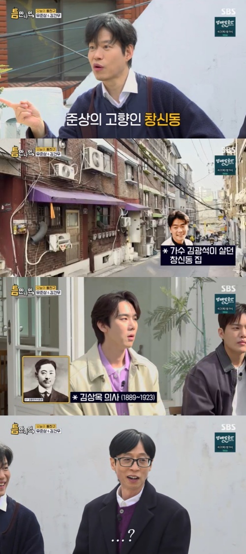 지난 24일 방송된 SBS 예능 프로그램 '틈만나면,'에는 배우 유준상, 김건우가 서울 종로구 창신동 '틈 친구'로 등장해 MC 유재석과 유연석을 만났다.