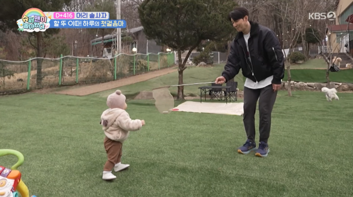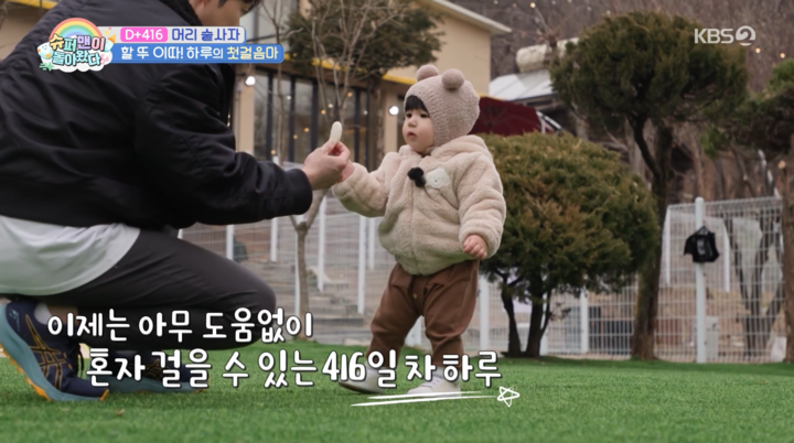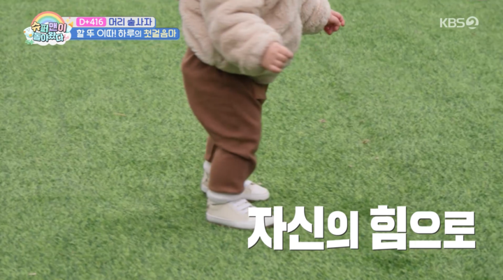 25일 방송된 KBS 2TV 예능 프로그램 ‘슈퍼맨이 돌아왔다’(이하 ‘슈돌’) 614회 ‘아빠 체험하러 왔습니다!’ 편에서는 생후 14개월 된 하루가 애견카페를 방문해 걸음마 맹훈련을 펼치는 모습이 담겼다.