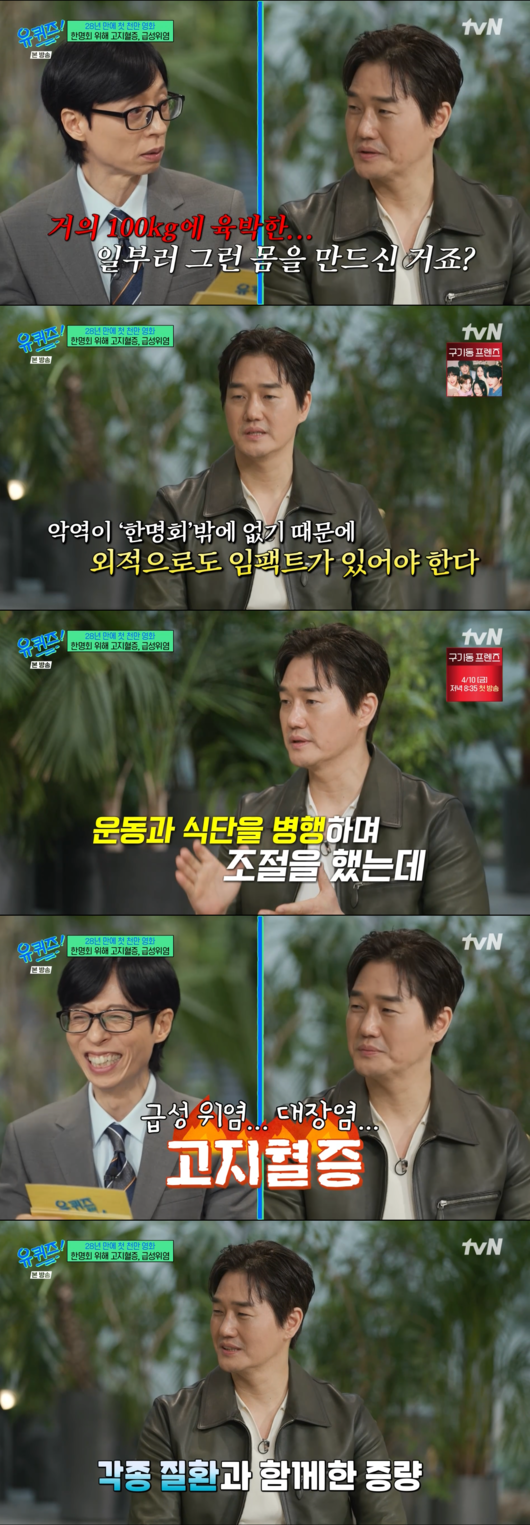유지태는 “몸에 무리가 많이 간다. 일단 많이 먹고. 운동과 식단을 병행했다. 그래도 아무래도 몸에 무리가 간다”라며 고충을 토로했다. 이어 유지태는 “고지혈증, 급성 위염, 대장염. 몸에 안 좋은 것만 다” 생겼다고 덧붙여 눈길을 끌었다.