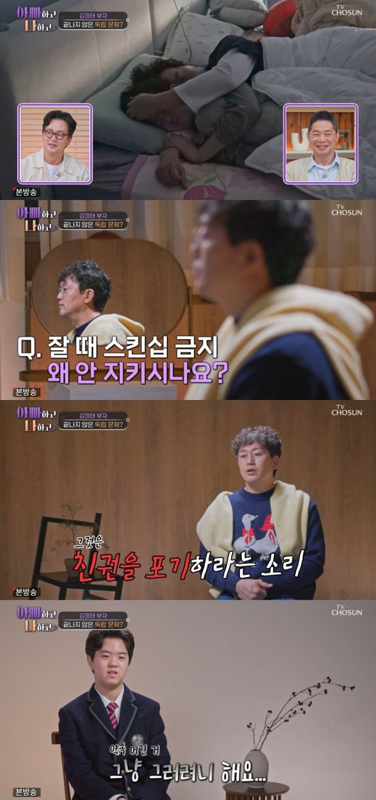 제작진은 “잘 때 스킨십 왜 약속 안 지키냐”라고 물었다. 김정태는 “그거는 친권을 포기하라는 소리랑 똑같다. 그거는 지가 호적을 파서 나가든지 ‘뽀뽀를 안 하겠다’ 그러면 그건 그냥 있을 수가 없다. 지금 방송이니까 그나마 덜 하고 있는 거다”라고 밝혔다.