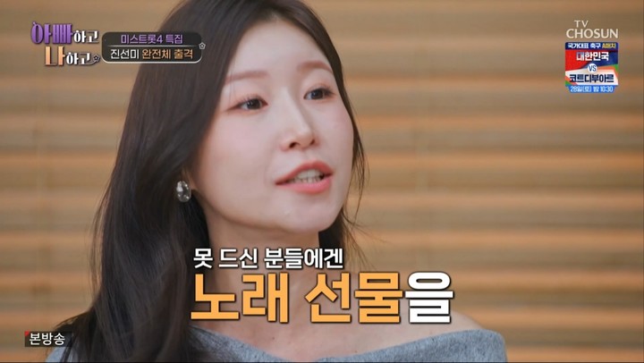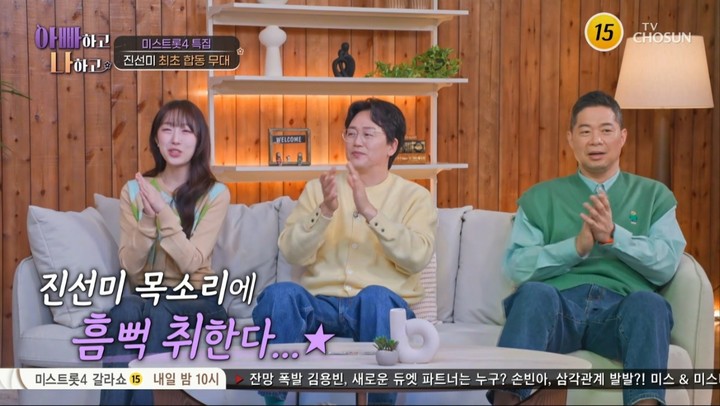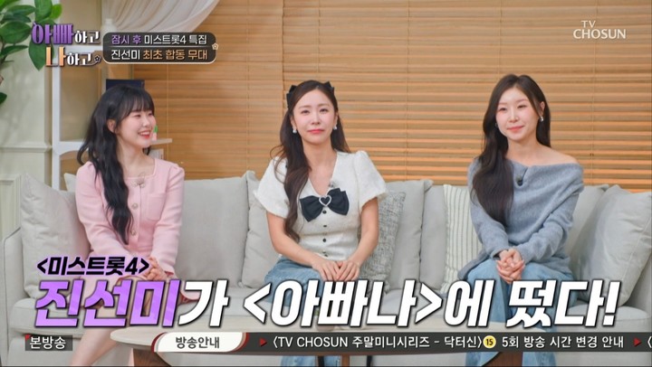 25일 방송된 TV CHOSUN '아빠하고 나하고 시즌3'에는 '미스트롯4' 진선미 이소나, 허찬미, 홍성윤이 특별 출연했다. 세 사람이 함께 예능 프로그램에 모습을 드러낸 것은 이번이 처음이다.