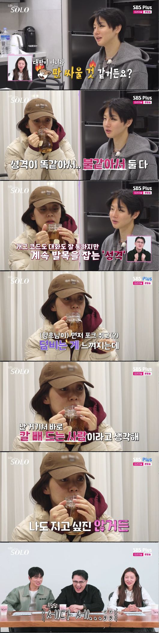 영호와 영숙에게 "우리 성격에 대해서 얘기했잖아요. 맞는 거 같은 거야 진짜로. 서로 고집 진짜 세다"라고 운을 뗐다. 이에 영숙 역시 "맞아"라고 즉각 공감하며 묘한 긴장감을 형성했다.