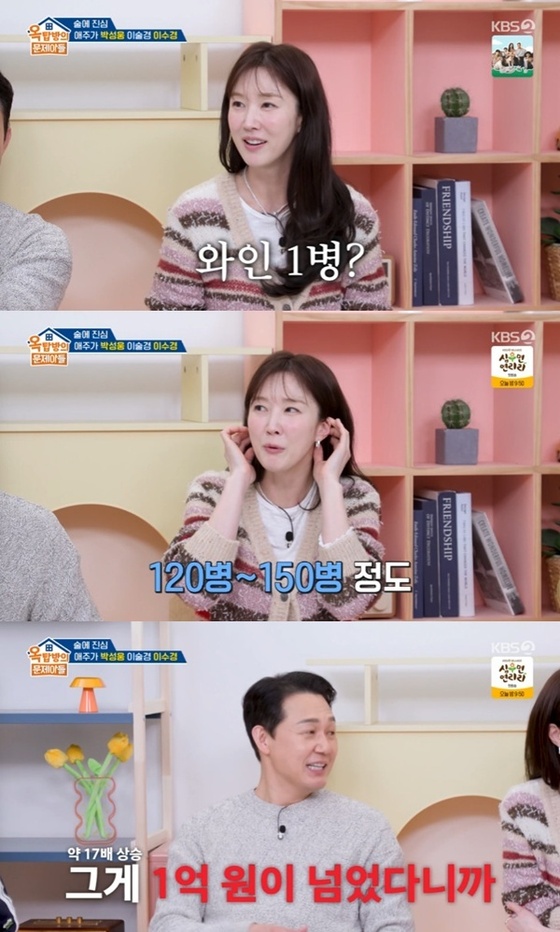 별명이 '이술경'인 이수경은 120병~150병 정도의 술을 소장하고 있다고 밝히며 술을 위한 관상용 테이블도 제작했다고 전해 모두를 놀라게 했다. 이어 이수경은 600만 원에 구매한 술이 현재 1억 원이 넘었다고 해 놀라움을 더했다.