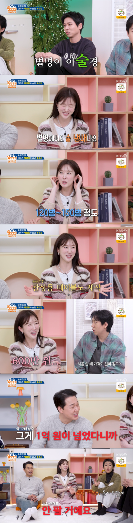 이수경은 술을 향한 진심을 드러내며 술 종류로 와인, 위스키, 소주는 물론 샴페인까지 갖추고 있다고 밝혔다. 특히 술을 위한 관상용 테이블까지 직접 제작했다는 이수경은 "다 먹으려고 산 거냐"는 김숙의 질문에 일말의 망설임 없이 "그렇다"라고 답해 눈길을 끌었다.