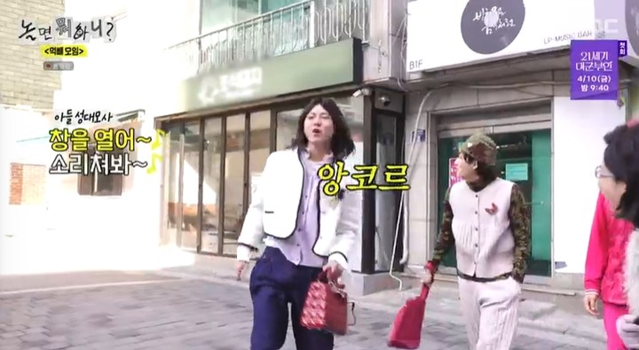 본격적으로 먹자골목에 들어선 멤버들은 길거리에서도 멈추지 않는 텐션을 자랑했다. '장훈이 엄마' 주우재는 가수 김장훈에 완벽 빙의해 노래를 열창하며 전매특허 발차기를 선보였고, 이를 참다못한 유재석의 분노 섞인 엉덩이 걷어차기가 이어졌다. 이용진 역시 이에 지지 않고 비보잉과 락킹 댄스를 선보이며 젊은 엄마의 면모를 드러내 눈길을 끌었다.