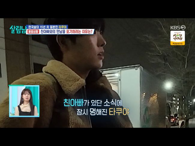 타쿠야는 “가고 있는데 되게 착잡하다. 갑자기 찾아가서 아들이다, 하고 선물을 주는 것도 이상할 거 같다”라며 뭣도 준비할 수 없는 아들로서의 마음을 드러냈다. 그리는 “저라면 무슨 말도 못 했을 거 같다. 아버지, 이러고 무슨 말을 하냐”라며 아버지와 애틋한 아들인만큼 오히려 타쿠야의 마음을 이해했다.
