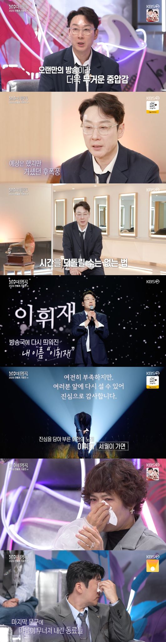 지난 28일 방송된 KBS2 ‘불후의 명곡’에서 이휘재는 MBN ‘배틀 인 더 박스’ 이후 4년 만에 방송 복귀 무대를 가졌다. 섭외 소식이 전해진 직후부터 온라인을 뜨겁게 달궜던 갑론을박을 의식한 듯, 그는 무대 위에서 시종일관 긴장한 기색을 감추지 못했다.