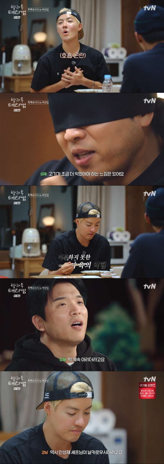 요리가 완성되자 안성재는 ‘흑백요리사’의 한 장면처럼 안대를 쓴 채 김태리와 함께 평가에 임했다. 첫 번째 메뉴는 강남이 야심 차게 준비한 수육. 음식을 맛본 김태리는 “수육이네 수육”이라며 담백한 평을 내놓은 반면, 안성재의 혀는 예리했다.