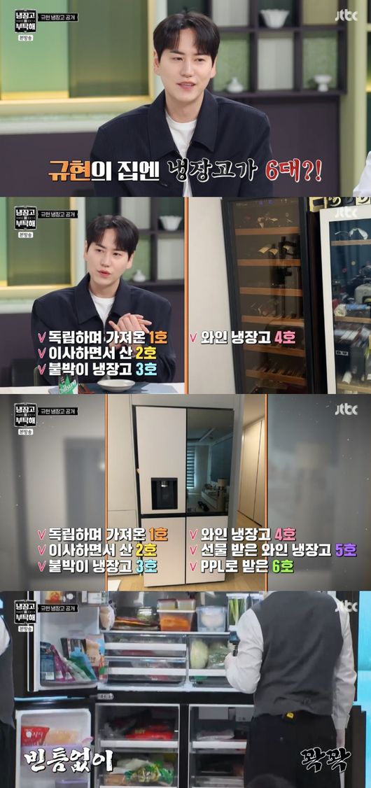 규현은 “사정이 있다. 숙소 생활을 18년 했다. 이사를 혼자 하게 되면서 그걸 가지고 들어왔다. 이사하면서 새로 사고, 붙박이 냉장고, 와인 냉장고, 또 선물 받은 와인 냉장고, 유튜브 해서 PPL로 받아서 총 6대가 됐다”고 밝혔다.