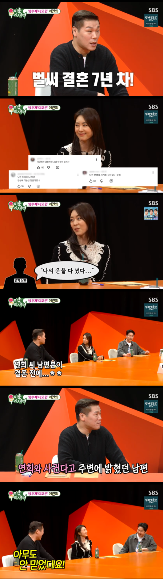 특히 주변에서 ‘나라를 구했다’는 반응이 쏟아지는 것에 대해 이연희는 “남편 친구분들이 그런 말을 많이 해주시는데, 남편 본인은 정작 ‘나의 평생 운을 아내를 만나는 데 다 썼다’고 말한다”고 밝혀 현장을 훈훈하게 만들었다.