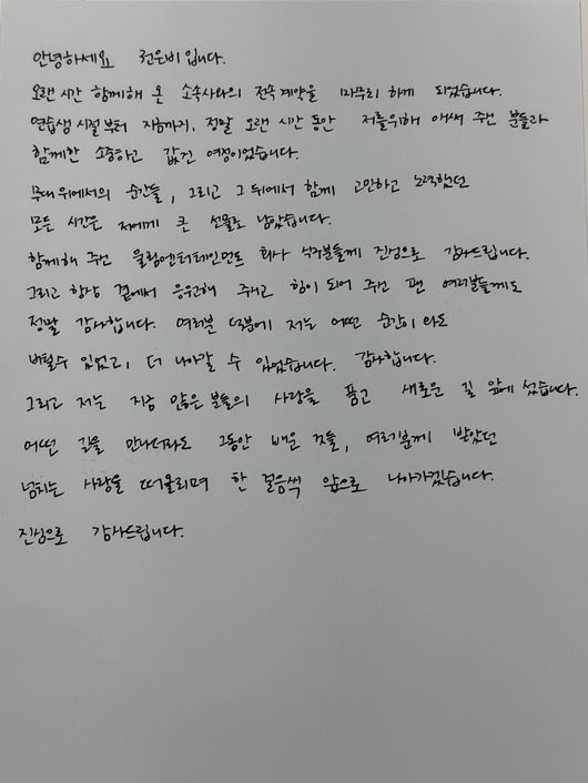 또한 팬들에게도 "항상 곁에서 응원해 주시고 힘이 되어 주신 팬 여러분들께도 정말 감사하다. 여러분 덕분에 저는 어떤 순간이 와도 버틸 수 있었고, 더 나아갈 수 있었다"고 고마움을 표했다.