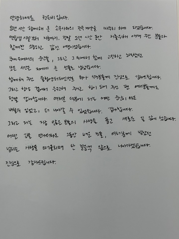 어떤 길을 만나더라도 그동안 배운 것들, 여러분께 받았던 넘치는 사랑을 떠올리며 한 걸음씩 앞으로 나아가겠습니다. 진심으로 감사드립니다.