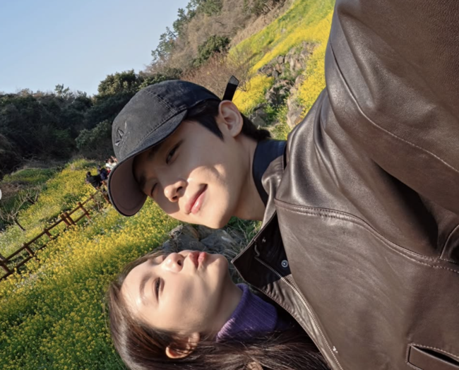 공개된 사진 속에는 두 사람이 노란 유채꽃이 만개한 들판을 배경으로 봄 데이트를 즐기는 모습이 담겼다.