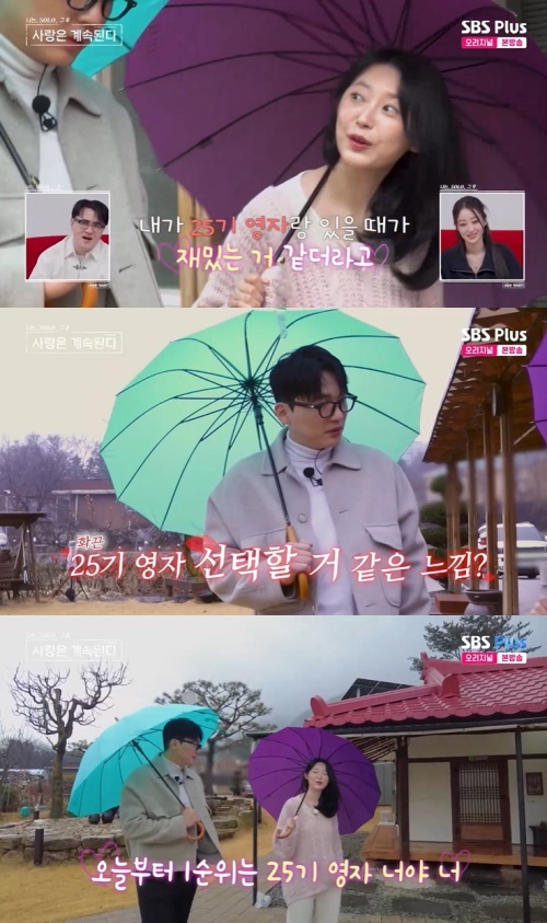 2일 오후 방송된 ENA, SBS Plus 예능 프로그램 '나는 SOLO, 그 후 사랑은 계속된다(나솔사계)'에서는 첫날부터 '인기녀'에 등극한 25기 영자가 18기 영호에게 직진 고백을 받았다.