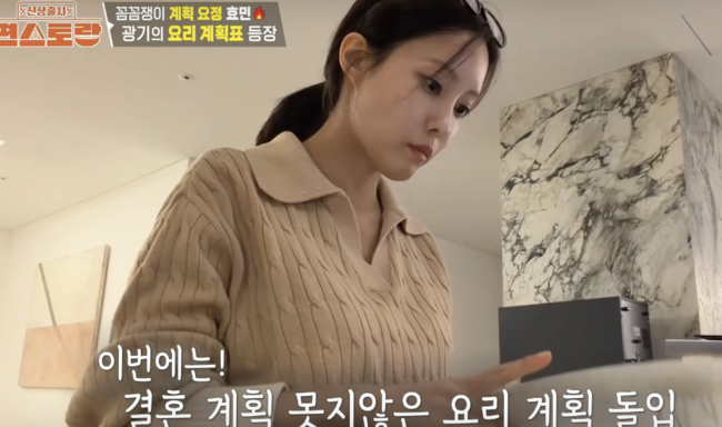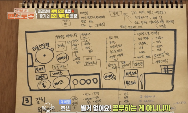 이어 효민은 조리대 위에 직접 작성한 계획표를 펼쳐 보이며 체계적인 준비 과정을 공개했다. 그는 “큰 요리는 미리 이미지 트레이닝을 한다. 제겐 다 계획이 있다. 요리는 계획”이라고 강조하며 남다른 ‘계획형 성향’을 드러냈다. 효민은 플레이팅 계획표까지 직접 그렸는데. 재료는 물론 그릇 구성까지 세밀하게 설계하며 레스토랑 못지않은 준비 과정을 보여줬고, 이를 지켜보던 이들은 “역시 파워 J답다”며 감탄을 이어갔다.
