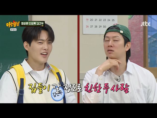 김희철은 “난 김건우 팬티도 안다. 집들이도 갔다. 우리 헬스장을 갔다”라며 자랑했다. 정상훈은 “김희철은 오늘 컨디션이 안 좋은 거 같다. 술 마셨냐”라며 대뜸 김희철의 얼굴을 지적해 웃음을 안겼다. 김희철은 “오늘 화장했다가 게스트가 남자 셋이 나온다고 해서 그냥 화장을 지웠다”라며 당당히 말했다. 김건우는 “<미우새>에서 이사 촬영을 하면서 김희철이 와서 만났다”라며 수줍게 말했다. 이에 서장훈은 "당당히 '미우새'라고 말해라"라고 말했다.
