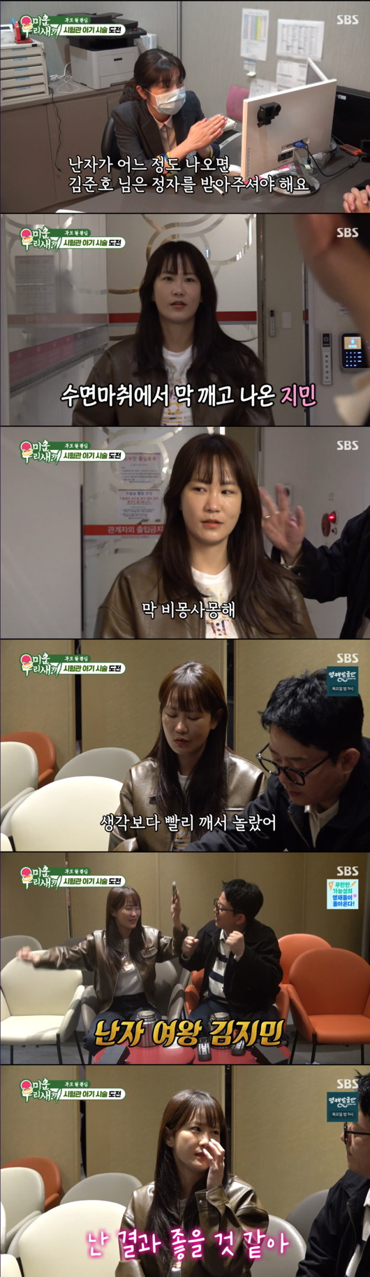 이어지는 방송에서는 김지민의 본격적인 난자 채취 과정이 그려졌다. 수술실에서 수면마취를 마친 후 나온 김지민은 비몽사몽한 상태에서도 아이를 향한 기대감을 감추지 못했다.