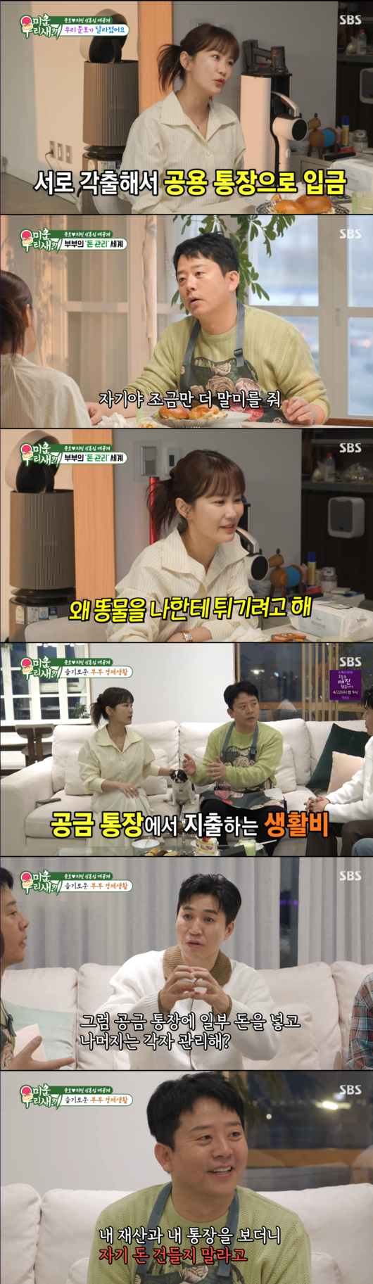 두 사람은 현재 공금 통장에 각자 돈을 모아 생활비를 사용하는 방식을 택하고 있다. 김지민은 처음엔 돈을 합치려 했으나, 김준호의 계좌 상황을 확인한 뒤 마음을 바꿨다고. 당시 김준호조차 자신의 잔고를 보고 “자기 돈 건들지 마라”며 스스로 포기했을 정도였다.
