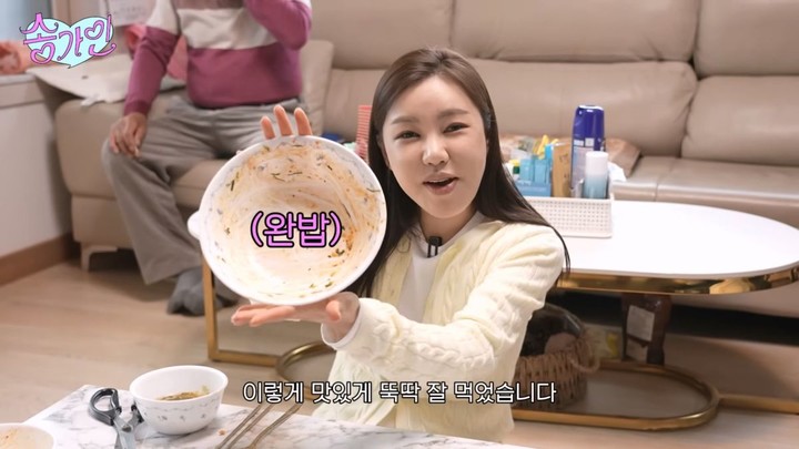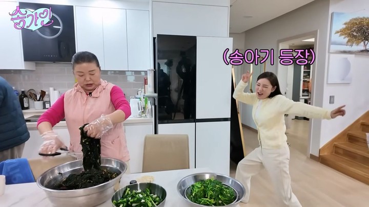 쪽파와 세발나물을 데치고 파래무침에 간장과 고춧가루를 넣어 한참 무침을 하는 중에 송가인이 2층에서 내려왔다. 송가인은 초등학생 딸처럼 애교를 부리며 내려왔는데, 제작진에서는 '송아기 등장'이라는 센스 있는 자막으로 연출했다.