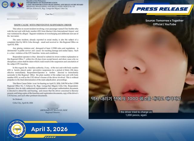 (MHN 김소영 기자) 그룹 투모로우바이투게더(TXT)의 멤버 수빈이 필리핀 여행 중 겪은 택시 요금 바가지 영상에 필리핀 정부가 해당 택시 기사에게 처분을 내리는 등 직접 대응에 나섰다.