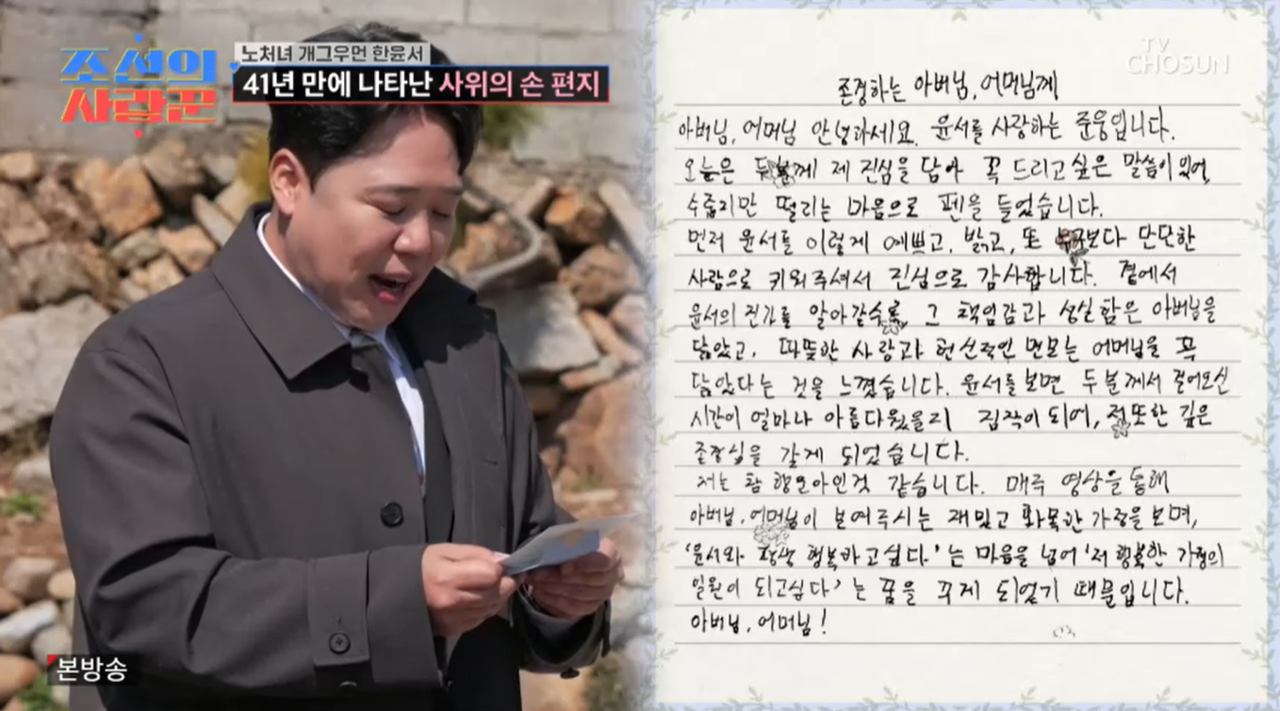 식사를 마친 후 문준웅 씨는 자필 편지를 꺼내 낭독했고, 결국 한윤서는 눈시울을 붉히며 감동을 감추지 못했다. 가족 모두의 축복 속에서 두 사람의 앞날에 대한 기대가 더욱 커지고 있다.