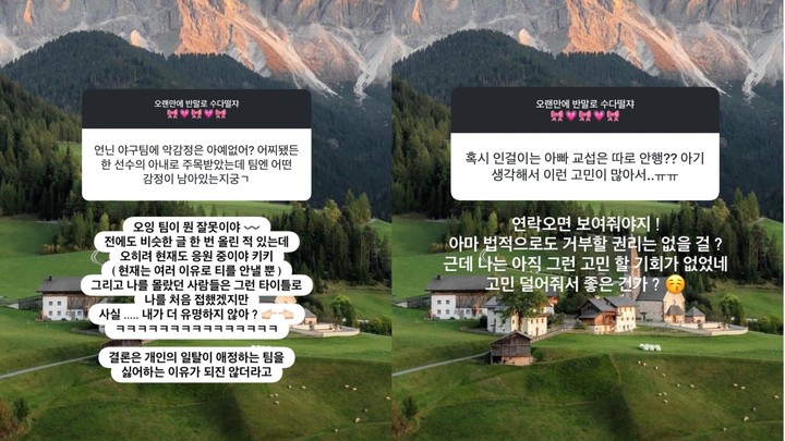 또 그는 야구팀에 대한 입장도 전했다. 한 누리꾼이 "야구팀에 악감정은 아예 없냐. 팀엔 어떤 감정이 남았는지 궁금하다"고 묻자, 김지연은 "팀이 무슨 잘못이냐. 오히려 지금도 응원한다"고 선을 그었다.