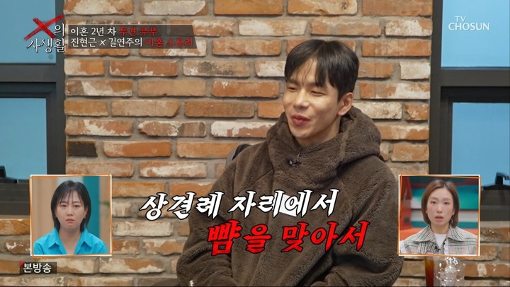 여기에 폭력성도 이혼 이유로 더해졌다. 진현근은 "술을 마신 상태에서 돌돌이로 눈을 찍혀 피가 났고, 아이를 안고 있는데 발로 눈을 차 안와골절까지 왔다"고 했다. 심지어 상견례 자리에서도 폭행이 있었다고 주장하며 "화장실로 불러 뺨을 때렸다"고 떠올렸다.