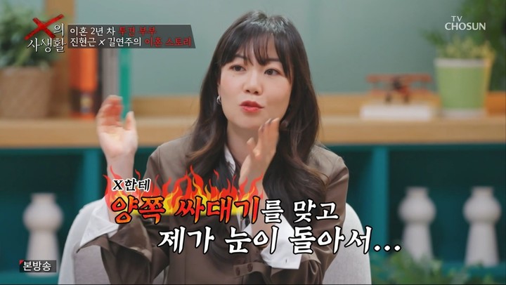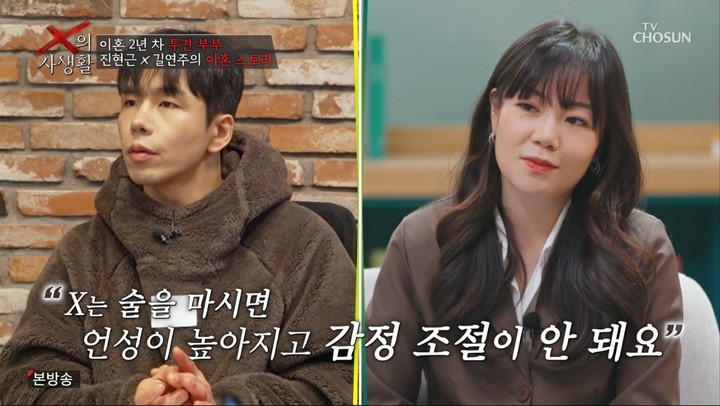 7일 방송된 TV CHOSUN 이혼 부부들의 입장 정리 리얼리티 'X의 사생활'에서는 '이혼숙려캠프'에 출연한 '투견부부' 진현근과 길연주가 폭로전 양상을 이어갔다.