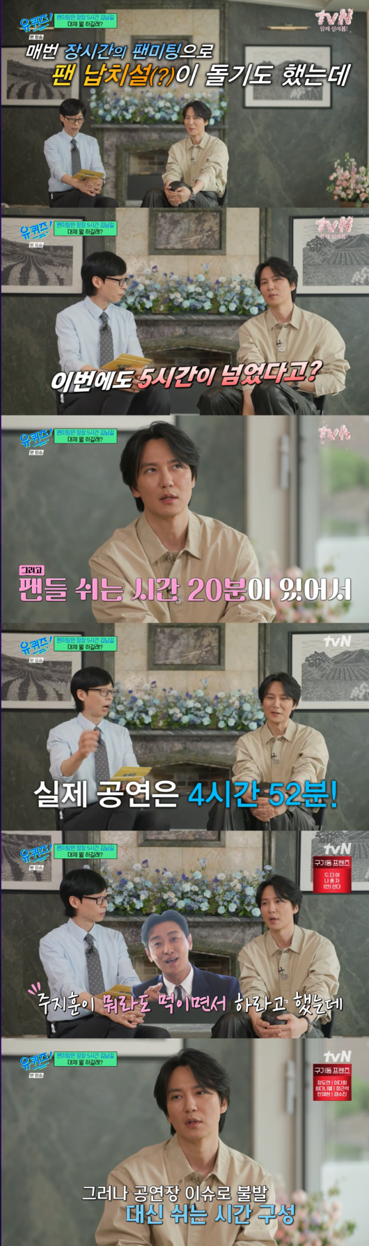 김남길은 팬미팅에서 무려 21곡의 라이브를 소화하며 5시간이 넘는 시간을 채웠던 일화를 털어놨다. 김남길은 “30분 줄여서 5시간 12분을 했고, 인터미션을 따지면 5시간이 안 됐다”라고 너스레를 떨었다.