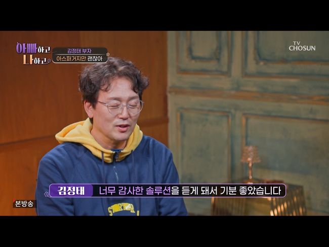 8일 방영한 TV CHOSUN '아빠하고 나하고’(이하 ‘아빠나’)에서는 공부에 남다른 흥미가 있으며 고등학교 진학을 앞둔 김정태의 장남 지후와 김정태 부부가 서울의 한 심리 관련 병원을 찾았다. 이들 부부는 아들의 특징을 보고 아스퍼거를 유추하고 있었다. 지후는 "나에 대해 드러나는 게 싫다"며 꽤 불편해했지만, 의사와의 면담을 피하진 않았다.
