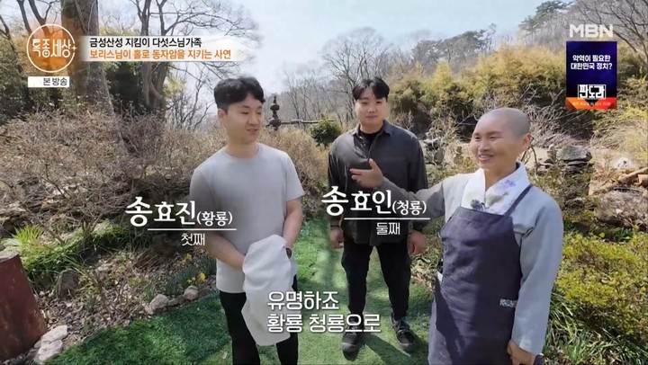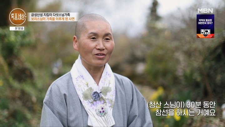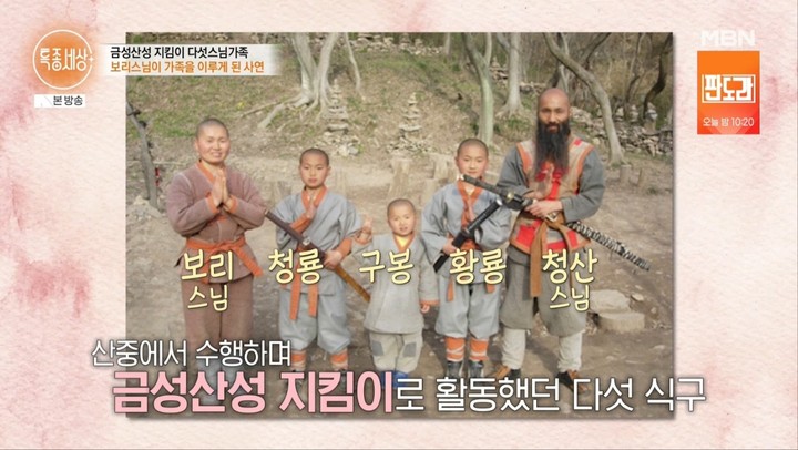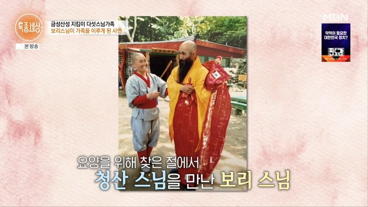 9일 방송된 MBN '특종세상'에서는 과거 큰 화제를 모았던 청산 스님과 보리 스님, 그리고 세 아이의 근황이 공개됐다. 한때 산중에서 수행하며 가족을 이루고 살던 이들의 특별한 삶은 많은 이들의 관심을 받았던 바 있다.