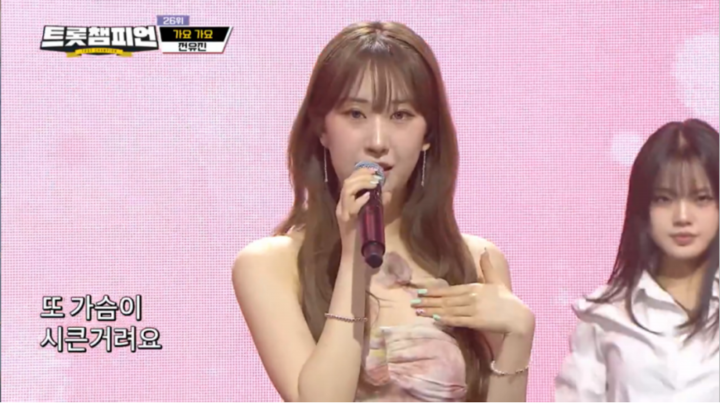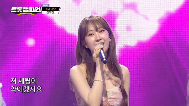 이날 전유진은 분홍빛 꽃을 연상시키는 드레스를 입고 등장해 밝고 사랑스러운 분위기로 무대를 열었다. 경쾌한 리듬 위에 특유의 구성진 보컬을 더하며 도입부터 몰입감을 끌어올렸고, 흔들림 없는 가창력으로 곡의 완성도를 높였다.