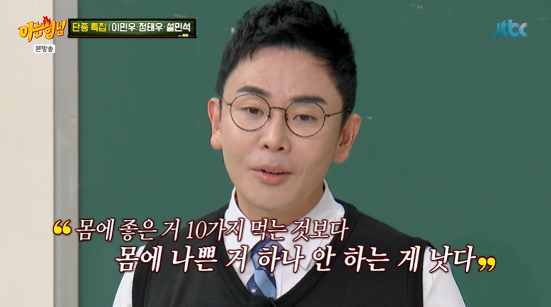 설민석은 자신의 동안 비결에 대해 “몸에 좋은 것 10가지를 챙기는 것보다, 몸에 나쁜 것 하나를 안 하는 게 더 낫다”고 설명했다. 이에 민경훈은 “말하는 걸 보니 동안은 아니다”라고 받아쳐 현장을 웃음바다로 만들었다.