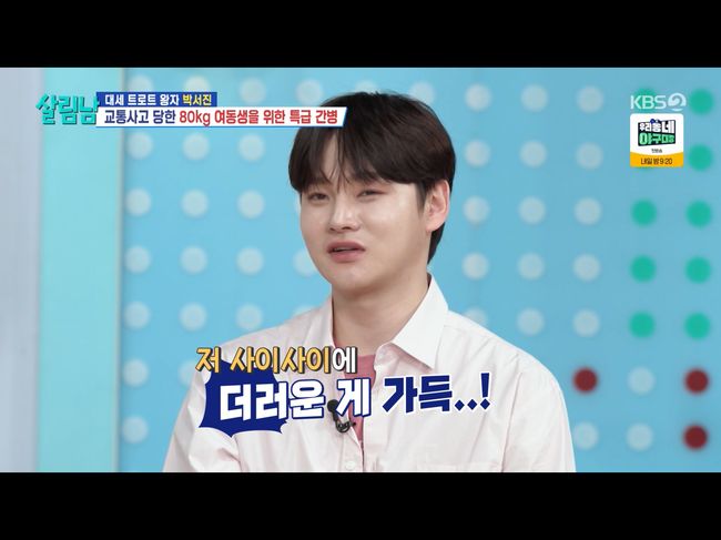 11일 방영된 KBS2TV 예능 '살림남2'에서는 트롯 황태자 박서진이 등장했다. 박서진은 동생 박효정과의 케미로 유명한데, 이날 박서진이 처음 모습을 드러낸 건 병원이었다. 입원해 있는 건 박효정이었다. 박서진은 박효정의 몸을 일으켜 세우려는 등 나름 간호를 했으나 박효정은 괴로워할 뿐이었다.
