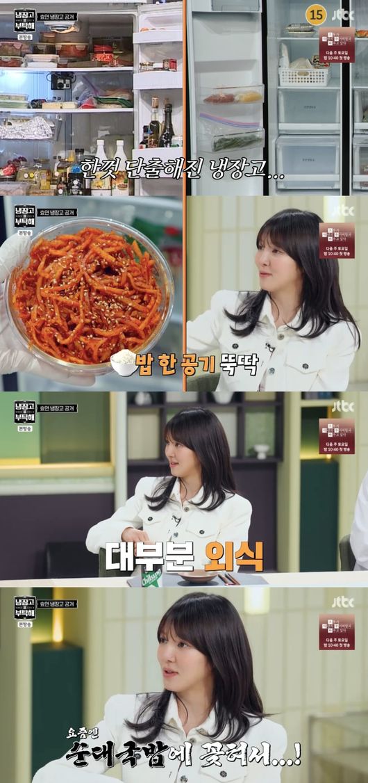 이윽고 공개된 효연의 숙소 냉장고. 하지만 혼자 살고 있는 만큼 내부는 단출했다. 가장 먼저 각종 반찬이 발견되자 효연은 “해외를 굉장히 많이 나가서 한국에 있을 때 맞춰서 반찬 해주신다. 어렸을 때 다 먹은 반찬들이다. 최고는 진미채다”라고 말했다.