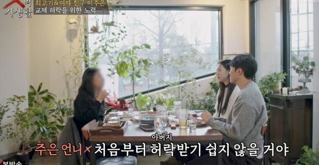 하지만 친정아버지에게 어떻게 허락받을지 조심스러운 모습. 둘째 언니는 아버지가 현재 막내딸이 최고기와의 만남을 모른다고 했다. 아빠가 무서워 5년째 한 마디 말 못했다고. 최고기는 “아버지 이야기 이해간다”며 담담하게 말했다. 여자친구 둘째 언니는 “아빠가 반대하면 어떻게 하나 쉽게 허락할거 같지 않다”며 걱정 , 최고기는 “걱정하는거 보다 일단 부딪혀 보려한다”고 했고둘재 언니도 “많이 부딪혀야할 것, 한번은 안 될 것”이라 하자 최고기는 “계속 도전할 것, 다른 사람보다 더 노력할 것”이라 했고둘째 언니는 “필요한거 있으면 옆에서 도와주겠다”고 했고 최고기도 “도움 많이 청하겠다”고 했다.