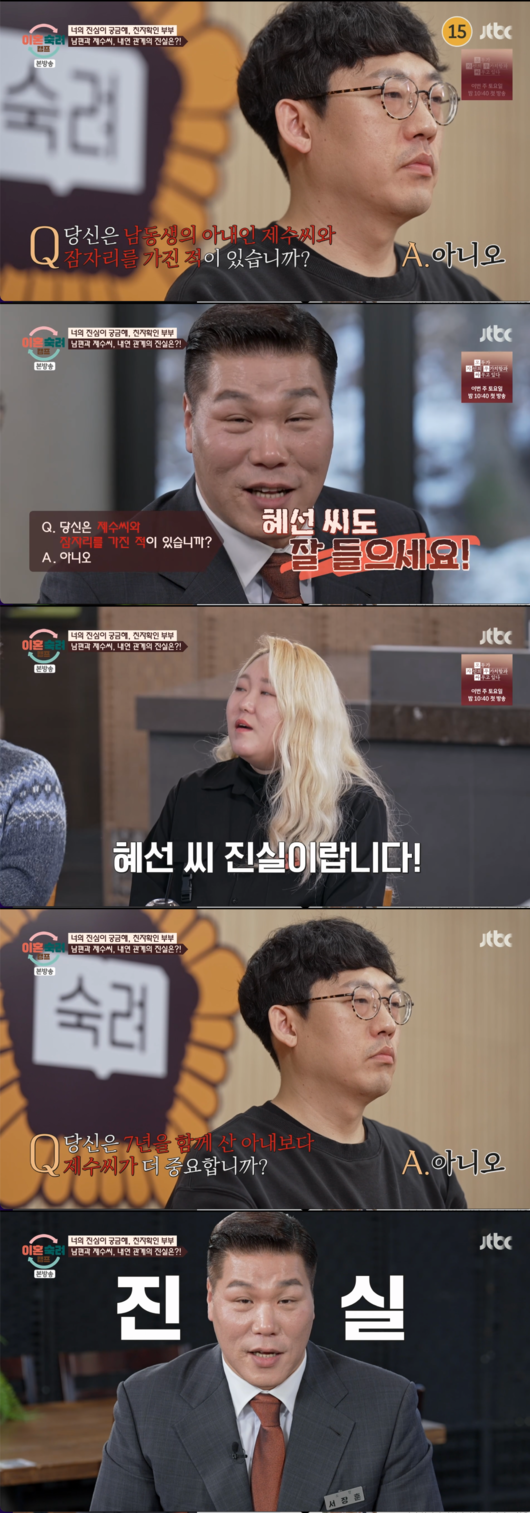 이어지는 질문 역시 날카로웠다. "7년을 함께한 아내보다 제수씨가 더 중요하냐"라는 물음에 남편은 다시 한번 "아니오"라고 답했다. 이 또한 진실로 밝혀지자 서장훈은 "결과는 진실이다. 요만큼의 껀덕지(?)도 없었다고 한다"라고 덧붙여 눈길을 끌었다.