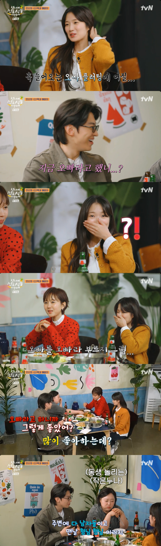[OSEN=박근희 기자] '언니네 산지직송 in 칼라페’ 방송인 덱스가 배우 김혜윤의 '오빠' 소환에 무장해제되며 명불허전 ‘플러팅 장인’의 면모를 과시했다.