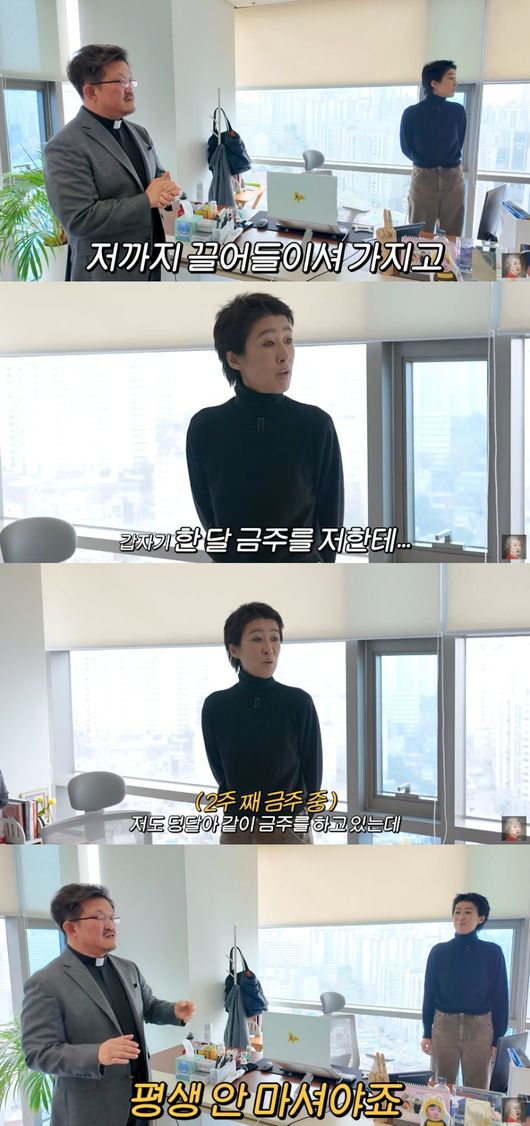 그렇게 함께 금주를 하게 된 홍진경은 2주째 금주 중이라고. 그는 “신부님이 혼자 금주하기 싫으시니까 나까지 끌어들였다 저는 그렇게 생각한다”라고 이야기했다.
