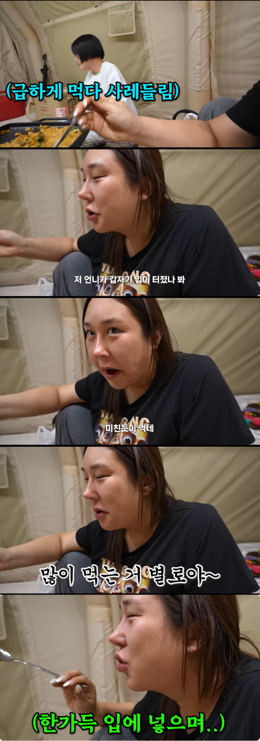 풍자는 지인 서주와 함께 장박해둔 텐트를 철거하기 전날, 마지막 저녁 식사를 즐기는 모습을 공개했다. 두 사람의 메뉴는 매콤한 알고니볶음. 서주는 “너무 맛있어. 양념 너무 맛있어”라며 폭풍 흡입을 시작했고, 풍자는 “열심히 드시고 내일 열심히 일해달라”며 텐트 철거를 앞둔 비장한 각오를 다졌다.