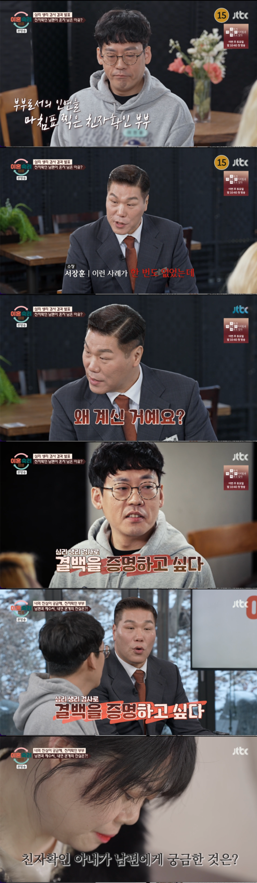실제로 이날 현장에는 출연진 최초로 아내 없이 5명이서 심리 생리 검사가 진행되는 파격적인 상황이 연출됐다. 이미 이혼을 확정 짓고 아내가 퇴소했음에도 불구하고, 남편 이천웅 씨만이 자리를 지키고 있었던 것.