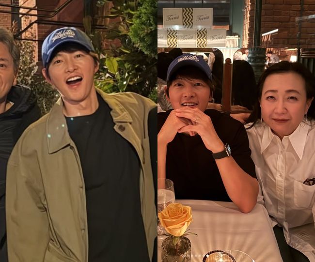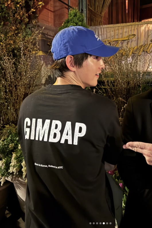 공개된 사진 속에서는 이민진 작가와 저녁을 즐기는 송중기의 모습이 눈길을 끈다. 송중기는 편안한 차림으로 자연스러운 모습이었으며, 평범한 검정 티셔츠 뒤에는 ‘GIMBAP(김밥)’이라고 적힌 문구가 눈에 띈다.
