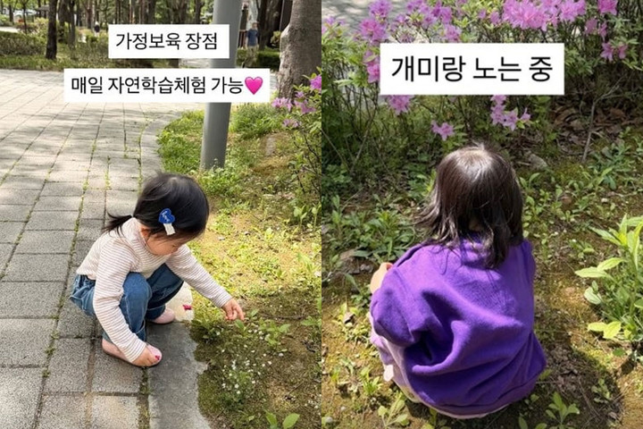 김다예는 "가정보육 장점"이라며 "매일 자연학습체험 가능", "개미랑 노는 중"이라고 밝히며 가정보육의 일상을 전했다. 재이는 길가에 앉아 곤충을 바라보며 시간을 보내는 등 또래 아이들과는 다른 방식으로 하루를 보내고 있었다.